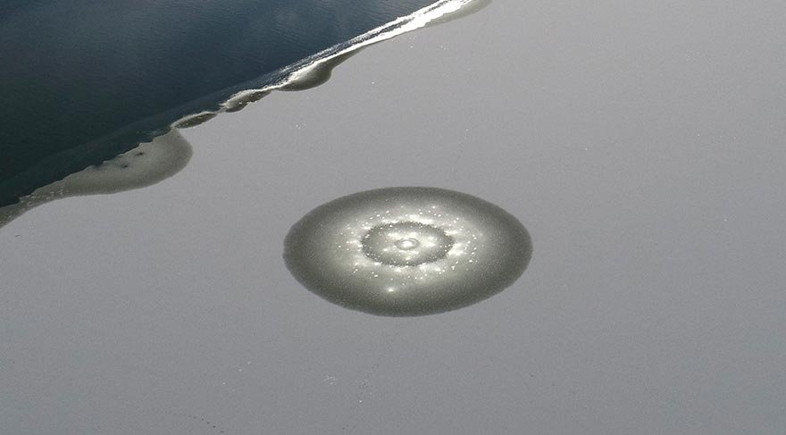 Drone ile havadan görüntülenen göl, buz tutan yüzeyi ile seyirlik görüntüler oluşturuyor.