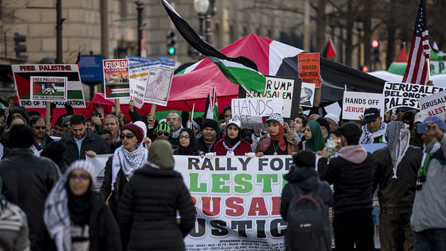 ABD'nin başkenti Washington'da toplanan binlerce gösterici, Başkan Donald Trump'ın Kudüs'ü "İsrail'in başkenti" olarak tanıma kararını protesto etti.
