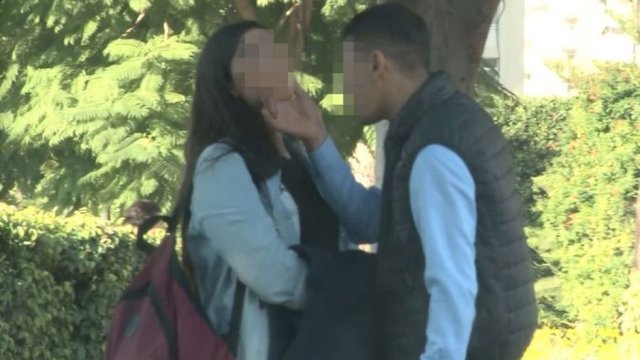 Genç bir erkeğin, bir kızla kaldırım üzerinde bilinmeyen nedenle tartıştığı görüldü. Genç kızın karşısındaki erkeğin dayak tehdidine maruz kalması ve çenesinden tutularak itilmesi kameralara yansıdı.