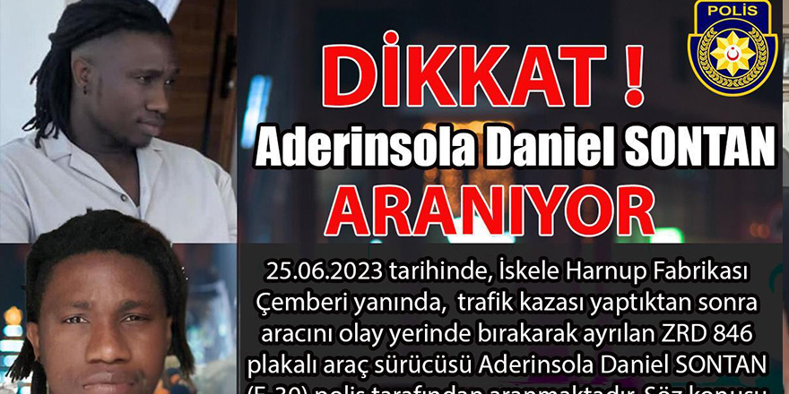 Gazimağusa- Karpaz Anayolu'nun 21-22'inci kilometreleri arasında, 25 Haziran 2023 tarihinde, harnup fabrikası çemberi yanında trafik kazası yaptıktan sonra aracını olay yerinde bırakıp ayrılan ZRD 846 plakalı araç sürücüsü 30 yaşındaki Aderinsola Daniel Sontan tespit edilerek tutuklandı.