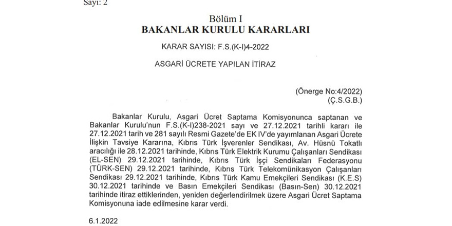 Resmi Gazete’de yayınlanan karara göre 27 Aralık 2021 tarihinde belirlenen yeni asgari ücrete itirazların ardından, asgari ücret yeniden değerlendirilmek üzere komisyona iade edildi.