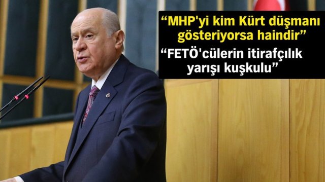 Bahçeli, FETÖ ile mücadelede son günlerde itirafçı olan bazı askerleri işaret ederek, "İtirafçılık yarışının kuşkulu yanları fazladır, birdenbire ortaya çıkmaları manidardır." diye konuştu. MHP lideri, AK Parti-MHP ittirafına yönelik "Kürt oyları" değerlendirmelerine tepki göstererek, "MHP'yi kim Kürt düşmanı gösteriyorsa haindir" açıklamasında bulundu.