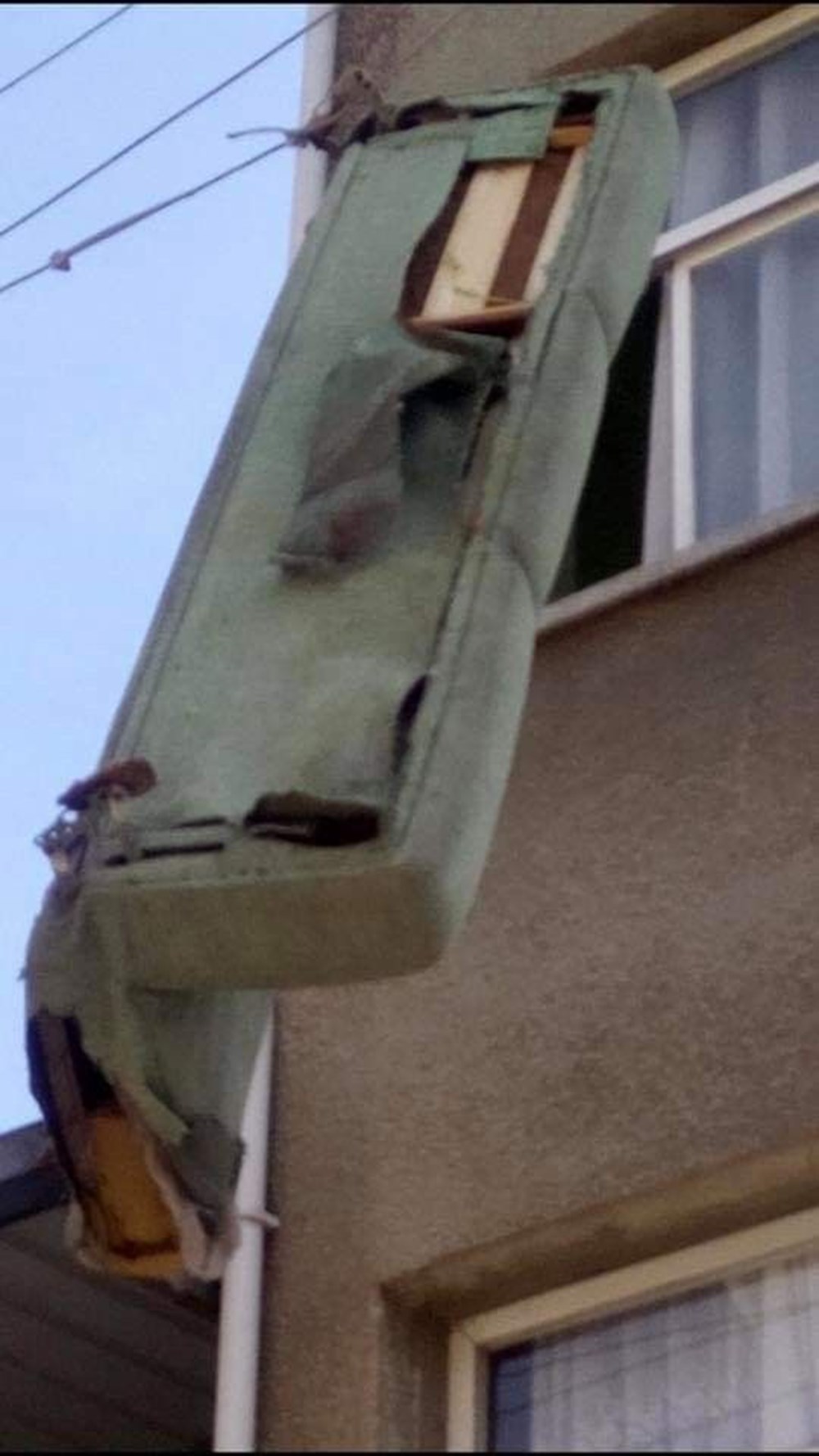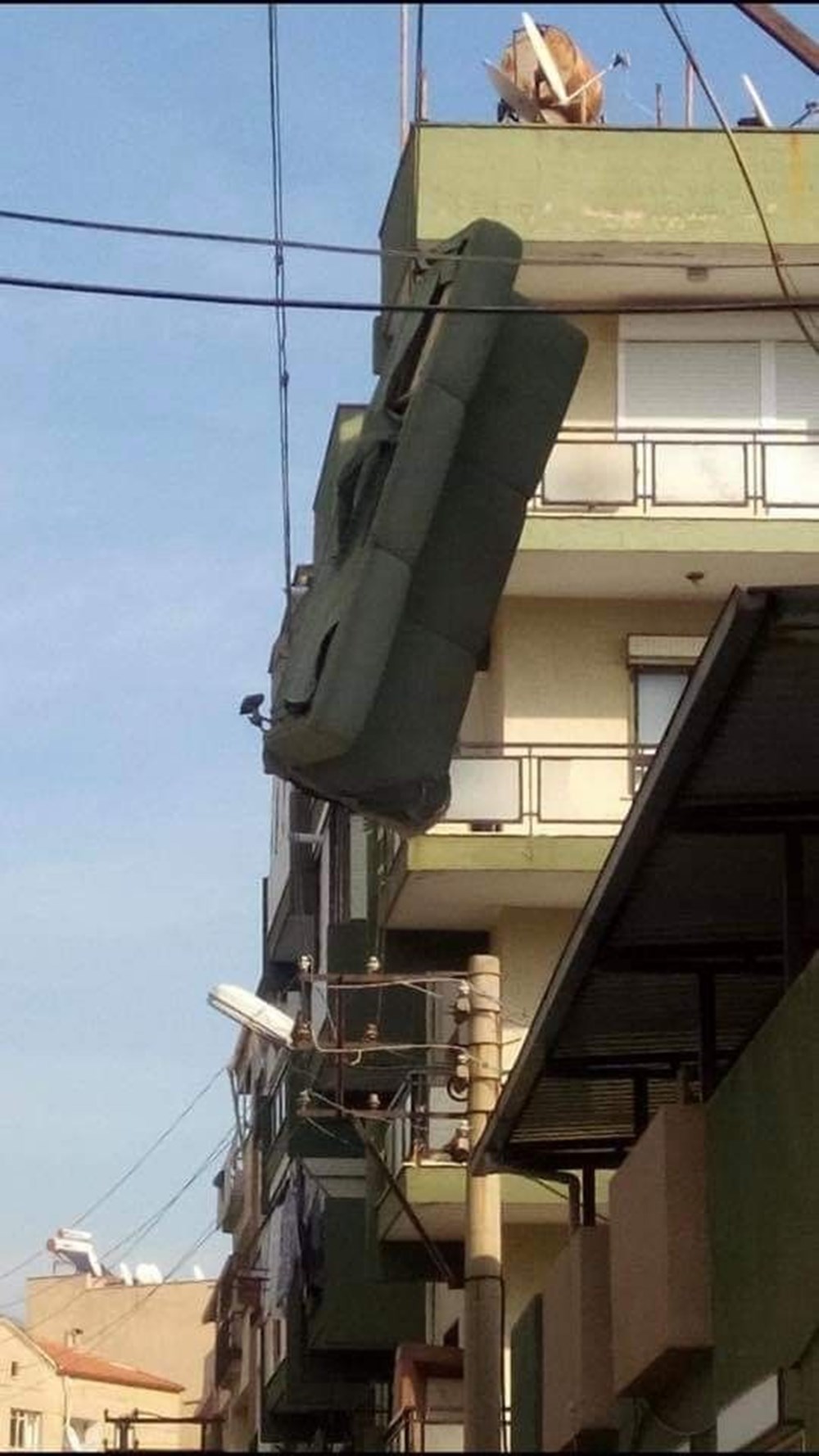 Üç katlı binanın çatı katından atılan üçlü koltuğun elektrik tellerine takılması ilginç bir görüntü oluşturdu.