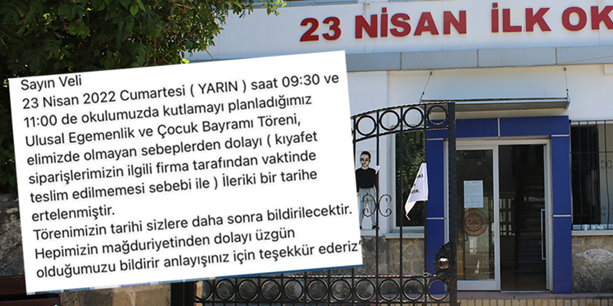 23 Nisan İlkokulu'nda bugün yapılacak kutlamalar, çocukların törende giyeceği kıyafetlerin yetiştirilemediği gerekçesiyle ertelendi.