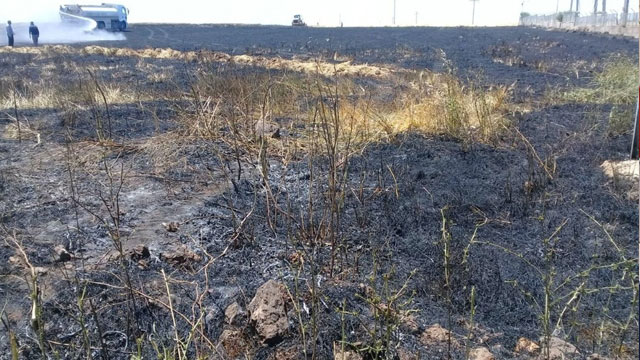Vadili -Yigitler köyleri arasında çöplük alanda bugün öğle saatlerinde meydana gelen yangında yaklaşık 500 dönümlük arazi içerisindeki ekili arpa ve anız ile 3 bin metrekarelik alanda bulunan akasya ve çam ağaçlarından oluşan genç fidanlar zarar gördü.