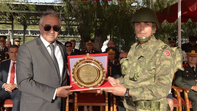 Cumhurbaşkanı Akıncı, görevi devreden Piyade Albay Ertuğrul’a, 2017-2018 yılları arasında 1. Piyade Alay Komutanı olarak vermiş olduğu hizmetleri anısına plaket verdi.