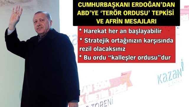 Cumhurbaşkanı Recep Tayyip Erdoğan, Ankara'da Ciner Grubu’nun 1.5 milyar dolar yatırım bedeliyle Türkiye’yi alanında dünyada lider konuma yükselten Kazan Soda Elektrik Üretim A.Ş. tesislerinin açılışında konuştu. Erdoğan, Afrin operasyonuyla ilgili olarak çok çarpıcı açıklamalarda bulundu. Erdoğan, Afrin operasyonu için "Harekat her an başlayabilir" dedi. Erdoğan, ABD'nin Suriye'nin kuzeyinde oluşturulacağını açıkladığı 30 bin kişilik birlikle ilgili olarak, "Bu ordunun adı kalleşler ordusudur. İşlerine gelmediğinde onları şantaj malzemesi olarak kullanmaya başlayacak olan da bu teröristlerdir." diye konuştu.