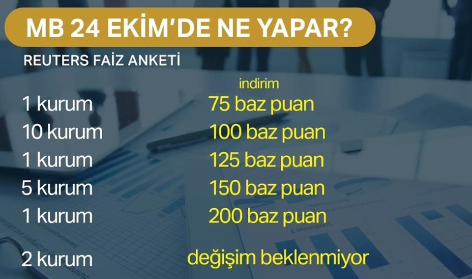 Merkez Bankası'nın indirim yapacağına kesin gözüyle bakılıyor. En iyimser tahminler 100 baz puanda ağırlık kazanıyor. Ancak kur stabil giderse 150 baz puanlık bir indirimin de gelebileceği konuşuluyor. Piyasada 250 baz puana kadar beklenti bulunuyor. PPK’nın bir sonraki toplantısı 12 Aralık tarihinde yapılacak.