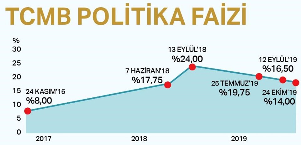 Merkez Bankası dün, bir hafta vadeli repo ihale faiz oranını (politika faizi) 250 baz puan düşürerek yüzde 16,50'den yüzde 14,00'e çekti.