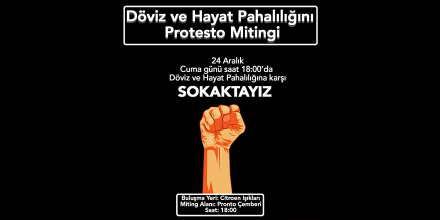 Sosyal medyada üzerinden organize edilen Döviz ve Hayat Pahalılığı Protesto Mitingi etkinliği Cuma saat 18:00’da düzenlenecek. Programa göre Citroen ışıklarında toplanılıp Pronto Çemberine yürünecek.