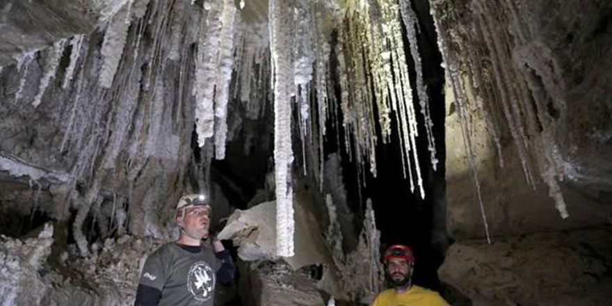 Mağarada tuz sarkıtları bulunuyor ve bazı duvarlar tuz kristalleriyle parlıyor: Bazı sarkıtların ucunda ise tuzlu su damlaları görülebiliyor.