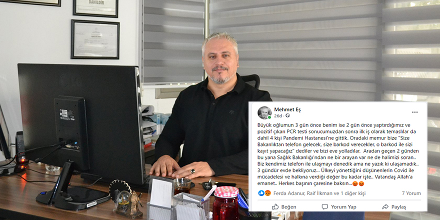 15 yaşındaki oğlu ile birlikte Covid-19'a yakalanan Haberatör Gazetesi Genel Yayın Yönetmeni Mehmet Eş, iki gün önce yaptırdığı PCR test sonucunun pozitif çıkmasına rağmen Sağlık Bakanlığı'ndan hiç kimsenin kendilerini aramadıklarını ve kendi başlarının çaresine bakmakla yüz yüze bırakıldıklarını sosyal medya hesabından açıklayarak, Sağlık Bakanlığı'na sitem dolu sözler etti.