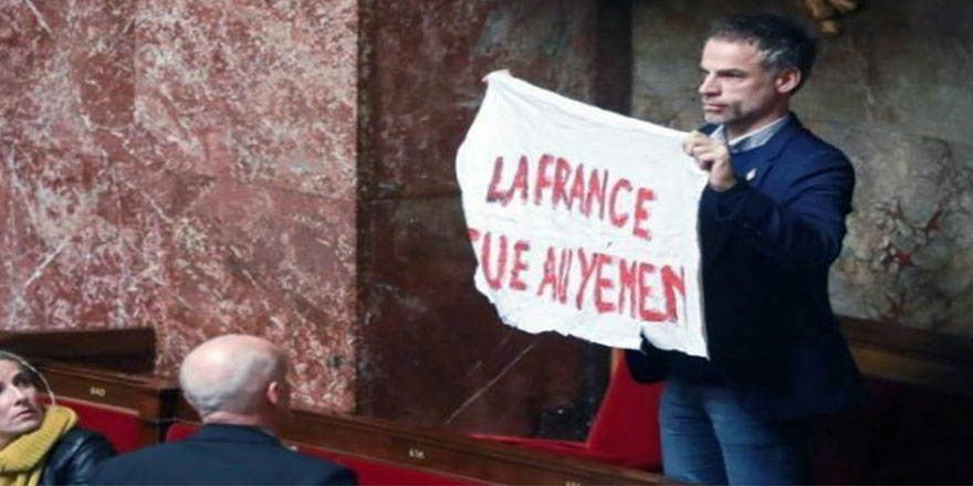 Fransız milletvekili SebastienNadot, hükümetin Yemen konusundaki sessizliğine ve Suudi Arabistan'a silah satmaya devam etmesine tepki göstermek için Ulusal Mecliste "Fransa Yemen’de öldürüyor" yazılı pankart açtı.