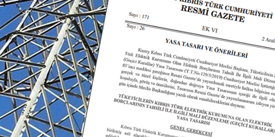 Elektrik Borçlarını ödemeyenlere yönelik tam ismiyle "Tüketicilerin Kıbrıs Türk Elektrik Kurumu’na Olan Elektrik Borçlarının Tahsili ile İlgili Mali Düzenleme (Geçici Kurallar) Yasası" olan af yasa tasarısı Cumhuriyet Meclisi’ne sevk edildi. Resmi Gazete’de yayınlanan tasarıda, yasanın Elektrik Kurumu’nun tüketicilere faturaladığı birikmiş asli alacaklarının ve gecikme zamlarının tahsil edilebilmesine olanak sağlamak amacı taşıdığı belirtildi. Tasarıda yasanın amacı “Bu Yasa ile elektrik tüketiminden dolayı ödeme süresi geldiği halde kısmen veya tamamen ödenmemiş kamu alacaklarının ve bu alacaklara ilişkin gecikme zamları ile faizlerin tahsil edilmesine olanak sağlanması amaçlanmaktadır” şeklinde belirtildi. 09:18 04 Aralık 2019 Gecikme zamlarına %65 ile %80 oranında af! Yasa tasarısı birikmiş borcu olan vatandaşlara ciddi ödeme kolaylıkları getiriyor.