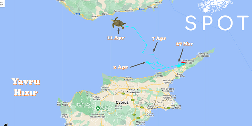 Açıklamada ayrıca “Şu ana kadar izlediğimiz 13 yavru yeşil kaplumbağadan biri olan Hızır, Kuzey Kıbrıs’taki beslenme bölgesini terk edip Türkiye’ye gitmeye başlayan ilk ve tek birey. Bu nedenle de bu yolculuğun sonunu çok merak ediyoruz” denildi.