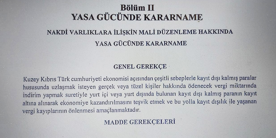 ‘Nakdi Varlıklara İlişkin Mali Düzenleme Hakkında Yasa Gücünde Kararname’ ile ‘yurt içi ve yurt dışında bulunan TL ya da döviz cinsinden varlıkların ekonomiye kazandırılması’nın amaçlandığı kaydediliyor