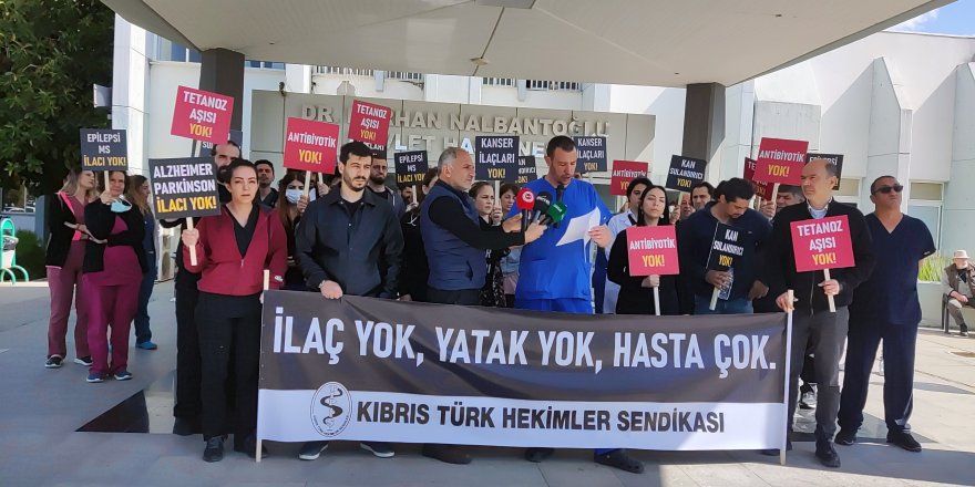 Tıp-İş Başkanı Dr. Şükrü Onbaşı, hekimlerin de katılımıyla bugün Lefkoşa Dr. Burhan Nalbantoğlu Devlet Hastanesi önünde saat 10.30’da basın açıklaması yaptı. Hekimler, “Tetanoz Aşısı, Kanser İlaçları Yok”, “Epilepsi, MS, Parkinson, Alzheimer İlaçları Yok” dövizleri taşıdı.
