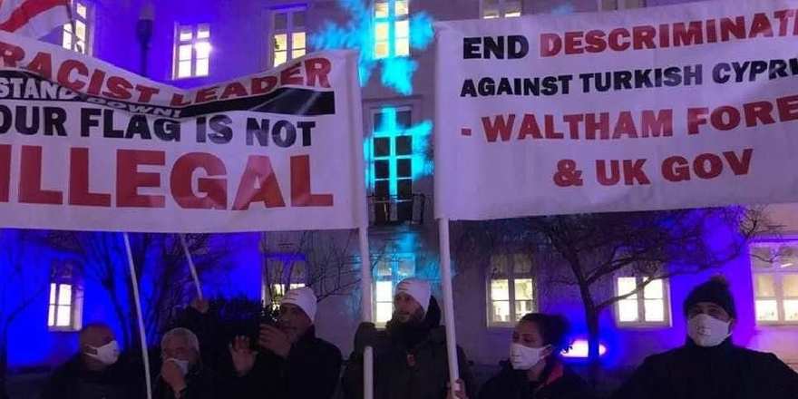 Başkent Londra'daki Waltham Forest Belediye binası önünde toplanan çok sayıda Kıbrıs Türkü, ellerinde KKTC ve Türk bayraklarıyla "Adalet istiyoruz", "Elinizi bayrağımızdan çekin, kimliğimizden çekin", "Biz varız. Kıbrıs Türküyüz", "Irkçılığa hayır" sloganları attı.