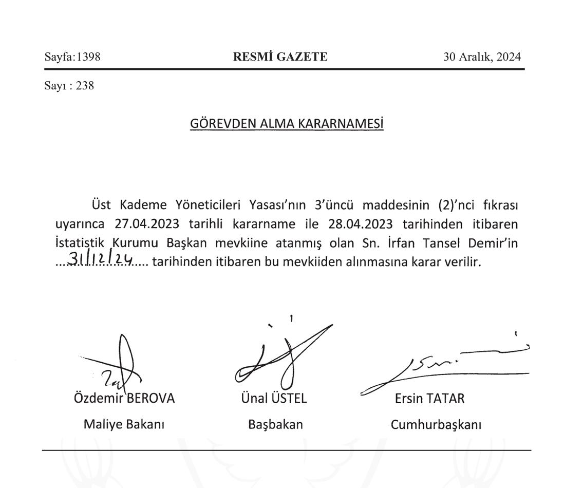 İstatistik Kurumu Başkanı İrfan Tansel Demir’in görevden alındığı açıklandı. Karar Resmi Gazete’de yayımlandı.