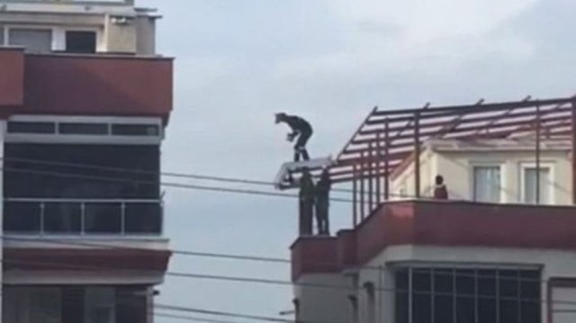 İHA'nın haberine göre, İzmir'de, 5 katlı bir apartmanın çatı katına üstünü tente ile kapatmak için işçiler çalışmaya başladı. Çatı katında demirlerin üzerine çıkıp tente takma işlemini herhangi bir güvenlik olmadan yapmaya çalışmaları bir vatandaşın cep telefonu ile çektiği görüntülere yansıdı. Yerden yaklaşık kot farkı ile birlikte 25 metre yükseklikte çalışan 3 işçinin güvenliksiz çalışması görenlerin yüreğini ağzına getirdi.