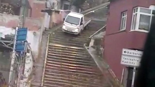 İHA'nın haberine göre olay İstanbul Kadıköy'de meydana geldi. Kestirmeden gitmeye çalışan bir kamyonet sürücüsü, yolu kullanmak yerine yayalar için yapılan merdiveni kullandı. Kemal Sunal filmlerini anımsatan olayda sürücünün kamyoneti ile merdivenlerden ağır ağır inişi cep telefonu kameralarına yansıdı. Görüntülerde kamyonetin ağır ağır merdivenlerden indiği görülüyor. Bu sırada okuldan çıkan iki çocuğun da merdivenlerden çıkmaya çalıştığı görüntülere yansıyor.
