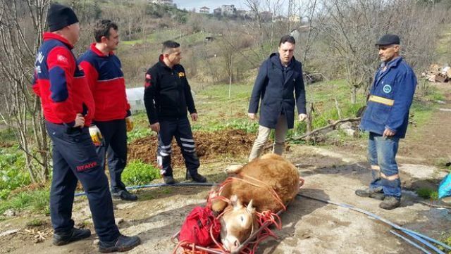 DHA'nın haberine göre, Kepez Mahallesi'nde bulunan Yaralı Barajı çevresinde otlayan dana, yaklaşık 10 metre yükseklikten yuvarlandı. Kayalıklara çarparak duran dananın sahibi Orhan Duru, kendi imkanlarıyla hayvanı kurtaramayınca, durumu itfaiyeye haber verdi.