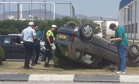 Lefkoşa'da, Dr Fazıl Küçük Bulvarı üzerinde, dün saat 12.15 sularında, Mehmetali Demirel’in yönetimindeki DV 439 plakalı salon araç ile batı istikametine doğru seyrettiği sırada, o esnada gidiş istikametine göre solunda bulunan Raif Denktaş Caddesi üzerinden anayola dikkatsizce giriş yapan plakası ve sürücüsü meçhul araca çarpmamak için direksiyonu sağa kırması neticesinde orta refüje çarpıp refüj içerisinde takla attı.