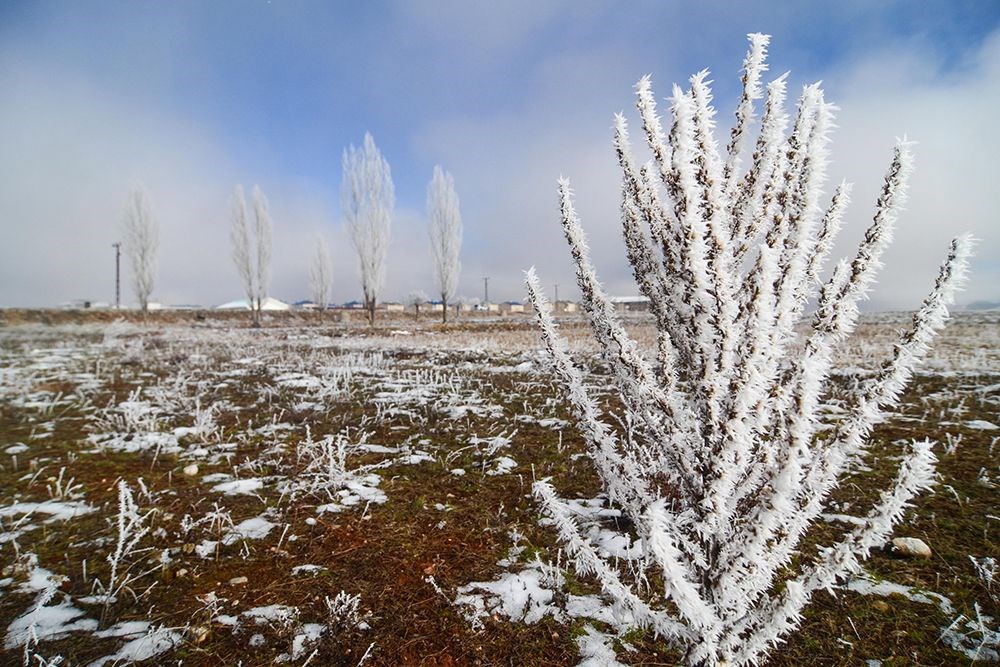 Soğuk hava nedeniyle araçların camları buz tuttu, ağaç ve bitkilerin üzerinde kırağı oluştu.