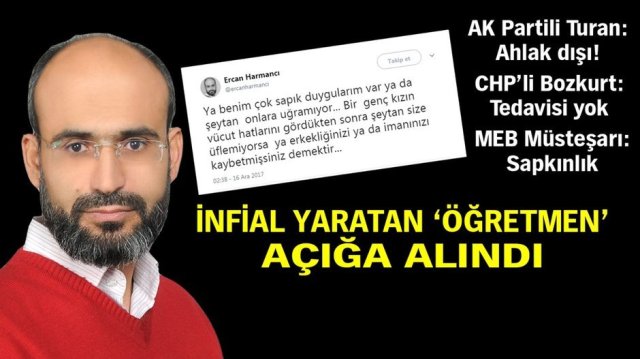 Felsefe öğretmeni Ercan Harmancı, Twitter hesabından beden eğitim derslerinde eşofman giyilmesini eleştirip, öğrencilerin eşofman giyerek zina yaptığını ileri süren mesajlar yayınlamıştı. Habertürk TV'nin haberine göre, Milli Eğitim Bakanlığı, skandal paylaşımların ardından felsefe öğretmeni Ercan Harmancı'yı açığa aldı.