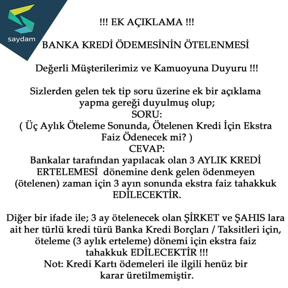 Ekonomist Mehmet Saydam, şirketi Saydam Muhasebe üzerinden yaptığı açıklamada, 3 aylık erteleme kredilerin anaparayı ertelediğini fakat faizleri kapsamadığını belirterek, erteleme ile birlikte 3 ayın sonunda geriye dönük faizlerin işlemeye devam edeceğini kaydetti.