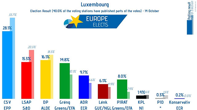 AB Komisyonu Başkanı Jean-Claude Juncker'in eski partisi Hristiyan Sosyal Halk Partisi (CSV) 2013 yılına göre 2 sandalye kaybederek 21, aşırı sağcı ADR 4 ve Korsanlar Partisi ise 2 sandalye elde etti.