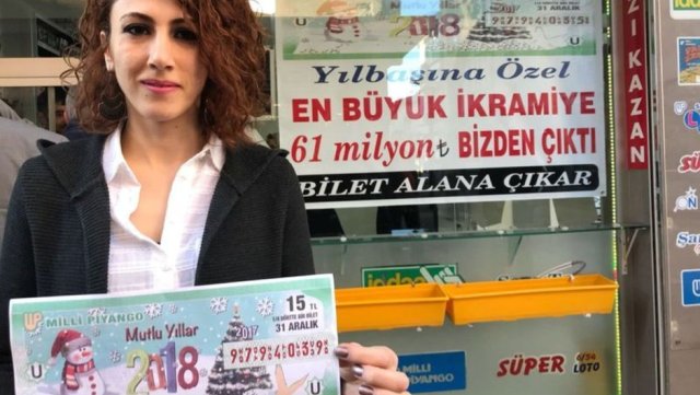 DHA'nın haberine göre, Milli Piyango İdaresi'nin yılbaşı büyük ikramiyesi 9794035 numaralı bilete isabet etti. Çeyrek biletlerden birinin, Ordu'nun Altınordu ilçesindeki bir bayi tarafından satıldığı belirlendi. Büyük ikramiyenin talihlisi henüz ortaya çıkmazken, Ordu'da da büyük heyecan yarattı. Bayi işletmecisi İnci Çıplak, Milli Piyango İdaresi Samsun Şube Müdürlüğü'nden satın aldıkları seri biletlere ikramiye isabet ettiğini, talihlinin de henüz ortaya çıkmadığını ifade etti.