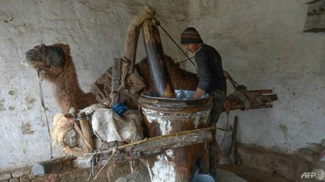 Değirmene bağlanan deve, daireler çizerek kesintisiz bir şekilde saatlerce yürüyebilmesi için bir buçuk ay eğitiliyor.