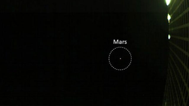 MarCO-B'nin üzerinde bulunan geniş açı kamera tarafından çekilen fotoğrafta yaklaşık 12,8 milyon kilometre uzaklıktaki Kızıl Gezegen nokta olarak seçiliyor.