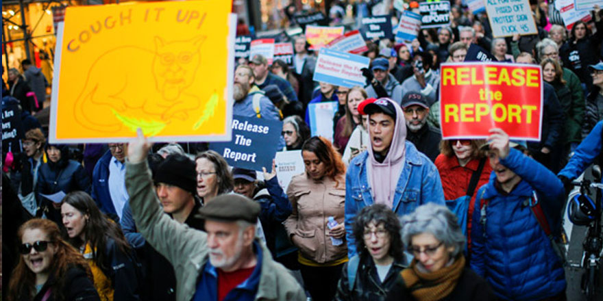 Raporun tamamının kamuoyu ile paylaşılması için yürüyen göstericiler, "Halkın gerçeği görmesi amacıyla Mueller raporunun tamamının açıklanmasını" talep etti.