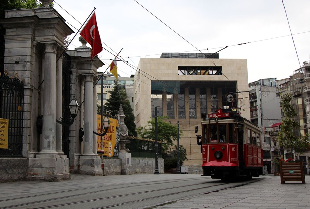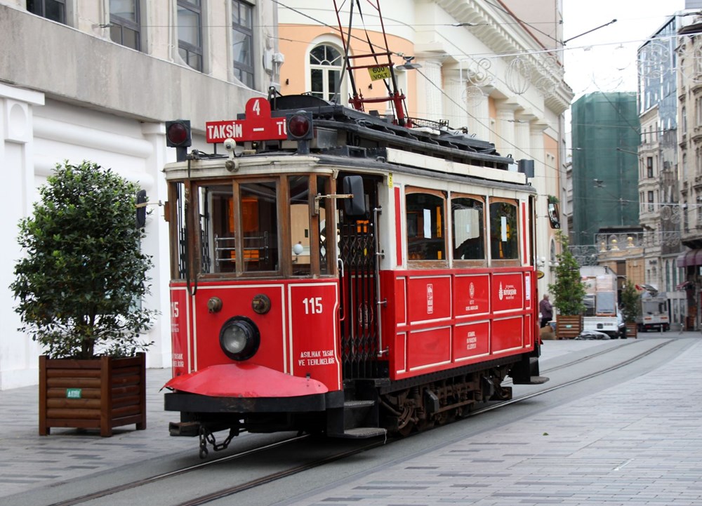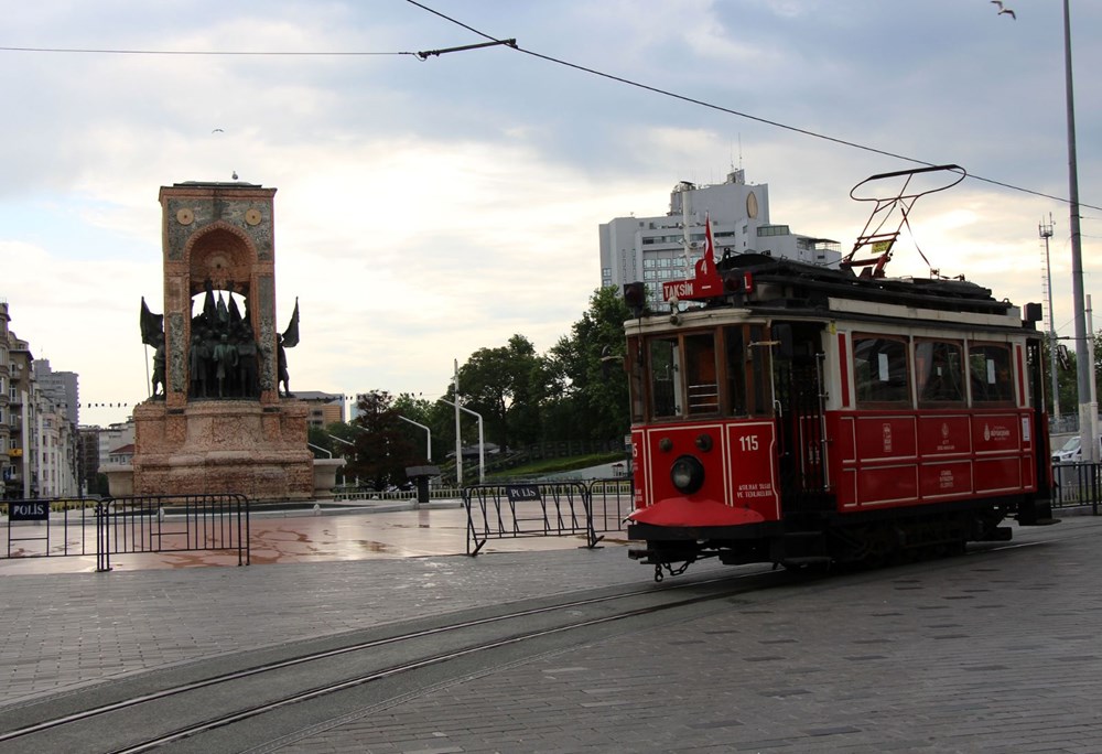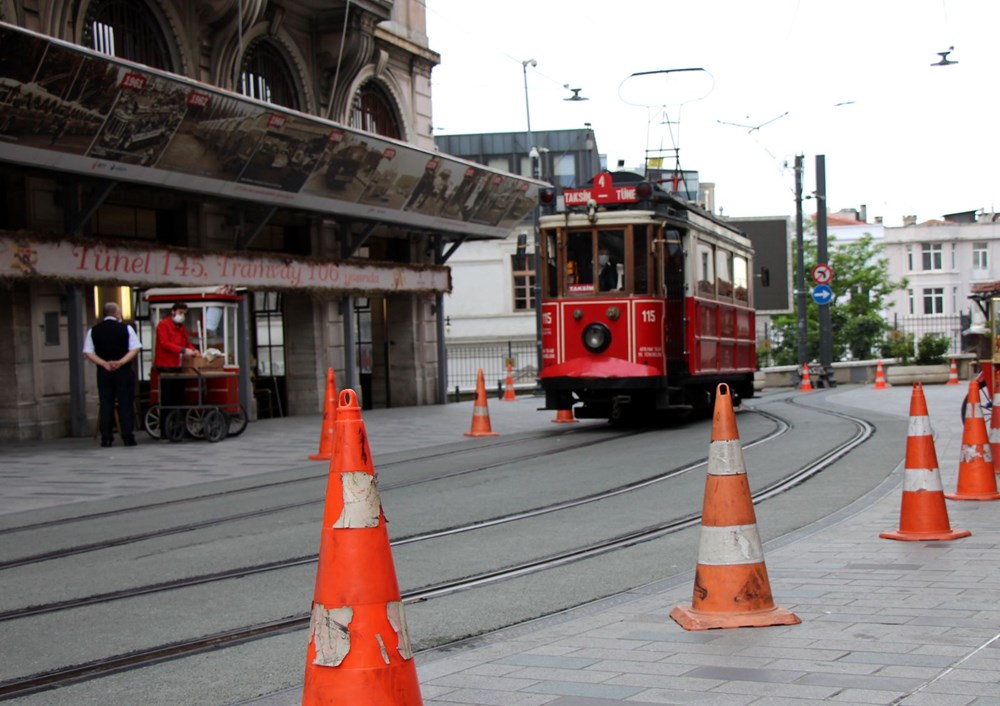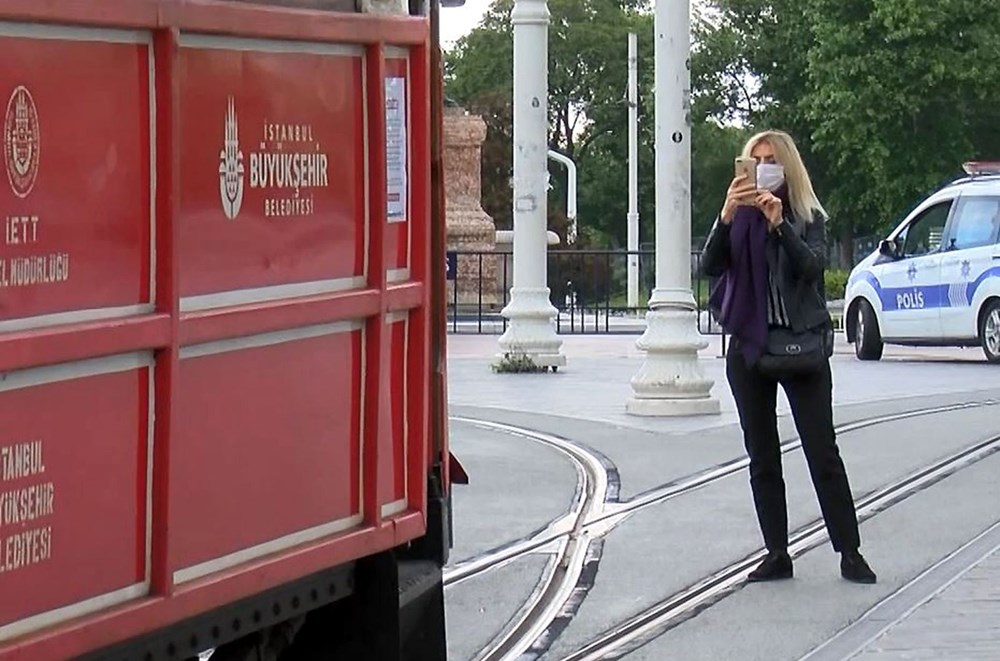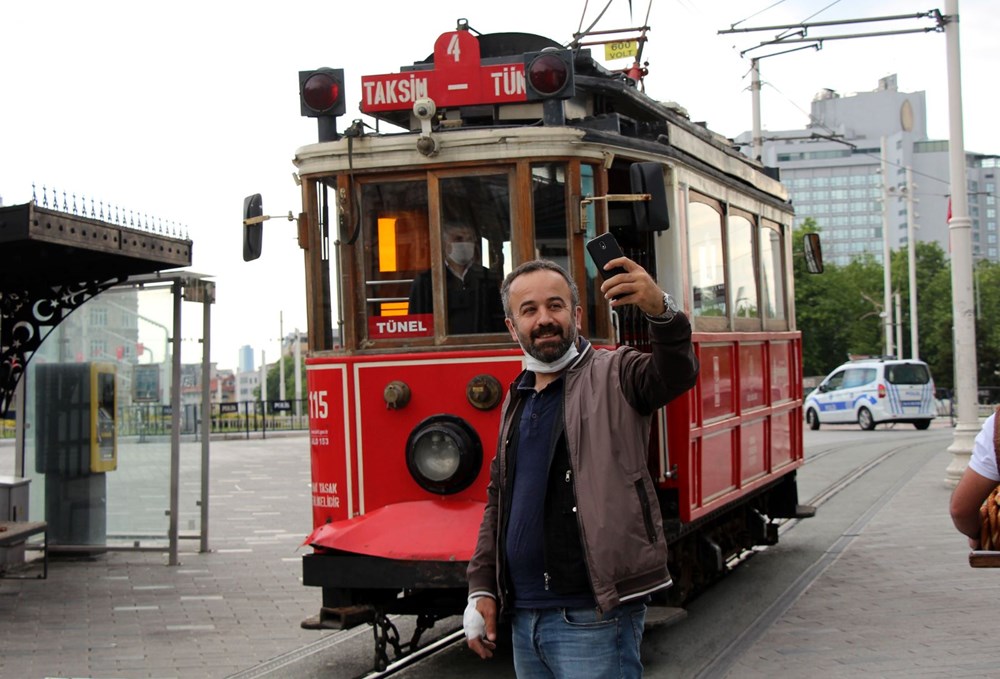 Yeni tip corona virüsle (Covid-19) mücadele tedbirleri kapsamında 5 Nisan'da seferlerine ara verilen nostaljik tramvay bugün ilk seferini yapmak için Taksim Meydanı'na geldi.