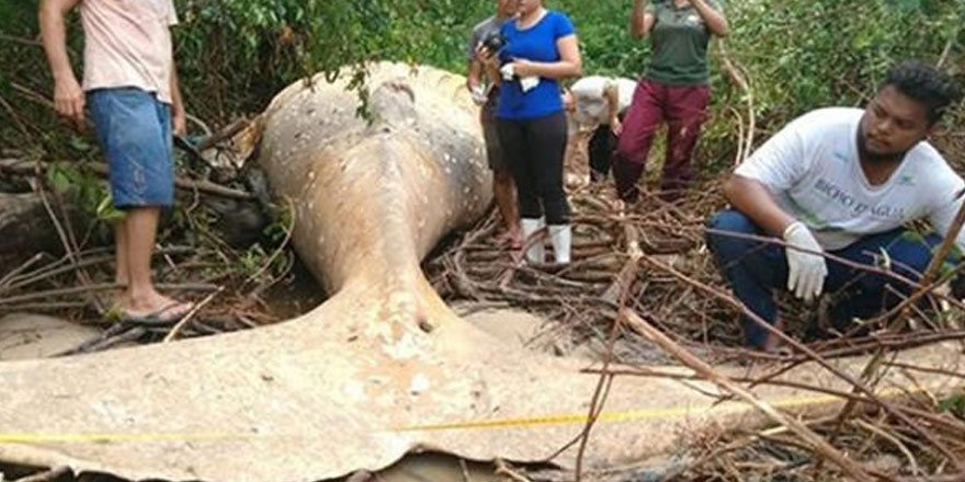 Kambur balina Amazon Nehri civarında yaşayan bölge halkı tarafından deniz kenarından 15 metre uzaklıkta bulundu.