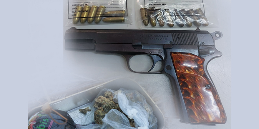 Narkotik ve Kaçakçılığı Önleme Müdürlüğü ekipleri, dün Yeşiltepe’ye düzenlediği operasyonda, M.Ş’nin evinde çeşitli miktar ve türde uyuşturucu, tabanca ve tabancaya ait şarjör ile 14 adet canlı mermi tespit etti.