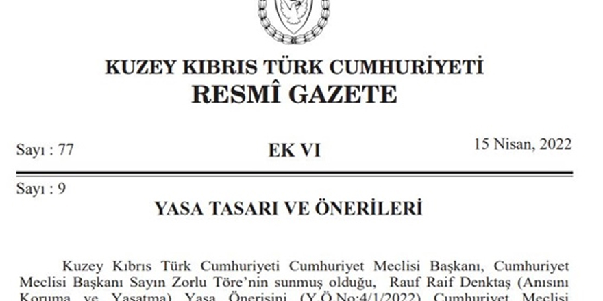 Cumhuriyet Meclisi Başkanı Zorlu Töre tarafından sunulan “Rauf Raif Denktaş (Anısını Koruma ve Yaşatma) Yasa Önerisi, Resmi Gazete’de yayımlanarak halkın bilgisine sunuldu.