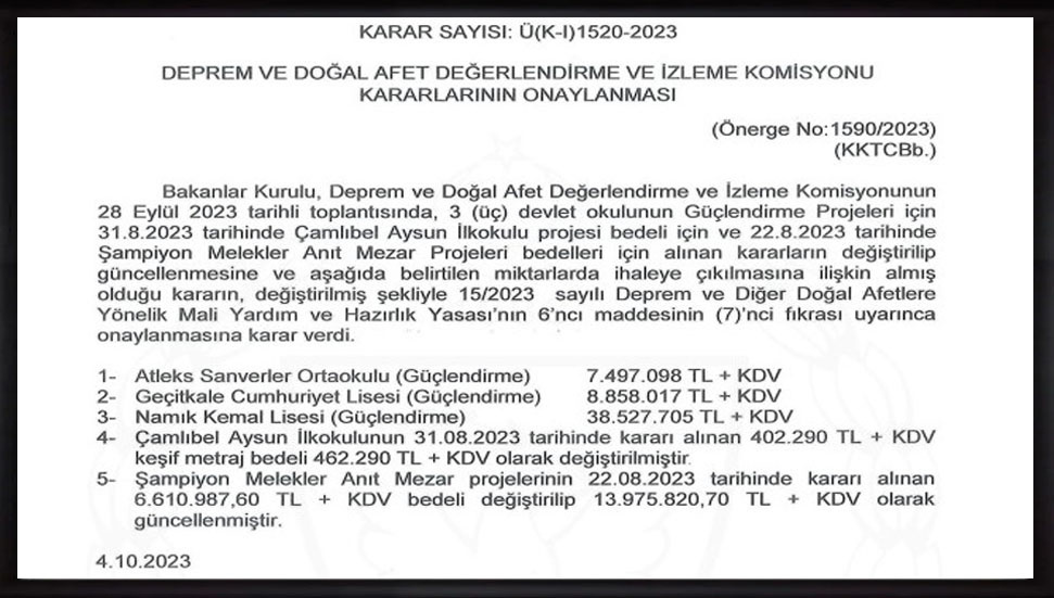 Bakanlar Kurulu, Deprem ve Doğal Afet Değerlendirme ve İzleme Komisyonu'nun 28 Eylül’de üç devlet okulunun güçlendirme projeleri bedelleri; 31 Ağustos’ta Çamlıbel Aysun İlkokulu projesi bedeli ve 22 Ağustos’ta Şampiyon Melekler Anıt Mezar Projeleri bedeli için alınan kararları güncelledi. Güncellenerek ihaleye çıkılmasına karar verilen miktarlar ise Resmi Gazete’de yayımlandı.