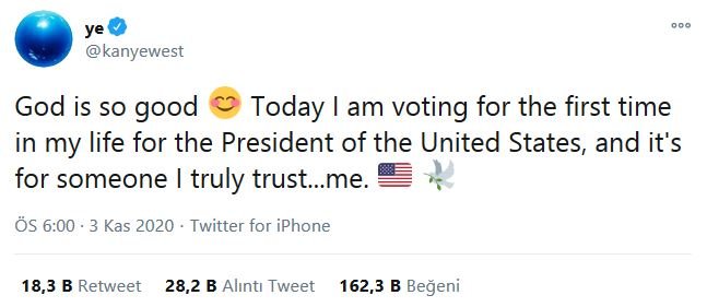 Euronews’ta yer alan habere göre, oy sayımına geçilmeden Twitter’den bir açıklama yapan West, “Tanrı çok iyi. Bugün, hayatımda ilk kez ABD başkanlığı için oy verdim ve bunu gerçekten güvendiğim biri için yaptım… ben” diyerek heyecanını paylaştı.