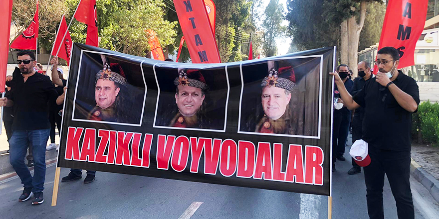 Yürüyüşçüler Lefkoşa sokaklarında boş tencere çalarak "direne direne kazanacağız" sloganları atıyor.