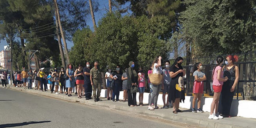 Türk Maarif Koleji'nde 500'e yakın öğrencinin PCR kuyruğunda beklediği gözlemlenirken, Girne 19 Mayıs TMK'da ise sağlık ekipleri 1 saat gecikmeyle geldi.