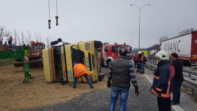TEM Otoyolu'nda devrilen kum yüklü hafriyat kamyonu nedeniyle trafik durdu. Kazada kamyon sürücüsü hafif yaralandı.