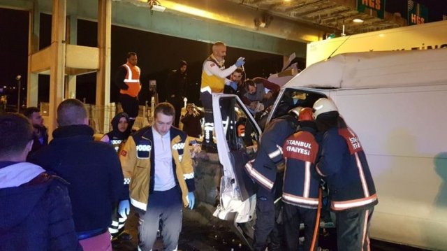 Avcılar'da sürücüsünün direksiyon hakimiyetini kaybettiği panelvan minibüs, TEM çıkış gişesinin beton bariyerine çarptı. Çarpmanın etkisiyle bacakları motor ve koltuk arasında sıkışan, vücudunun üst kısmı ise camdan dışarı savrulan sürücü ağır şekilde yaralandı.