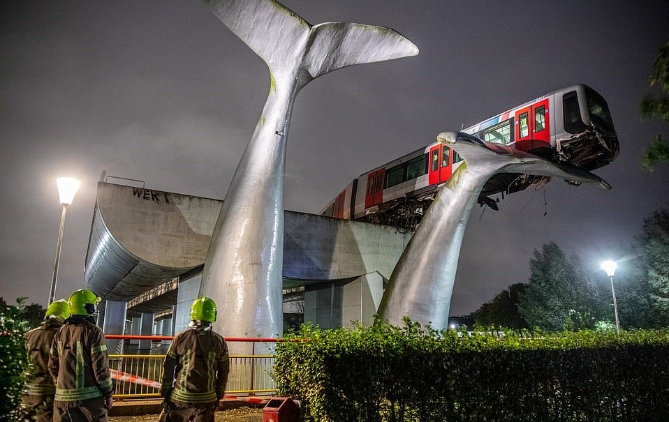 Hollanda’nın De Akkers metro istasyonunda meydana gelen metro kazası korkuttu. Metro istasyonunda meydana gelen kazada, bakım için boş sefer yapan tren, duramayarak bariyeri aşarak, 7.5 metre yükseklikteki dev balina heykeline çarptı. Tren daha sonra 7.5 metre yükseklikte asılı kaldı.