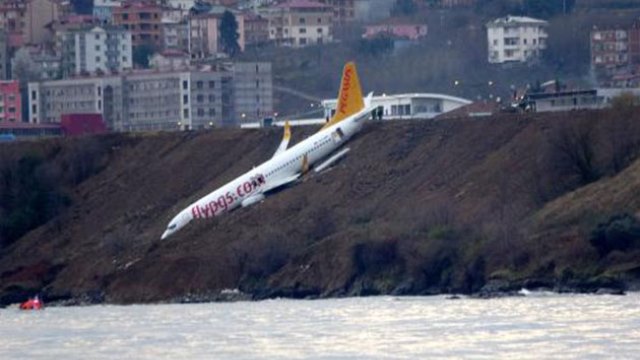 Trabzon seferini yapan ve Trabzon Havalimanı'na indikten sonra pist başında manevra yaparken, pistten çıkan yolcu uçağı, denize 25 metre kala yamaca saplanıp durabildi.