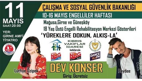 11 Mayıs Cuma günü, "Yüreklere Dokun Alkış-la" sloganıyla saat 20.00’de Girne Amfi Tiyatro’da , Kıbrıslı Sanatçı Lütfiye Özipek ile Avustralyalı sanatçı Faydee’nin konseri yer alırken; özel gereksinimli gençler de dans ve müzik gösterisi yapacak. Etkinlikte özel gereksinimli gençlerin merkezlerde yaptığı el işi oyma ve seramik eserleri de sergilenecek.